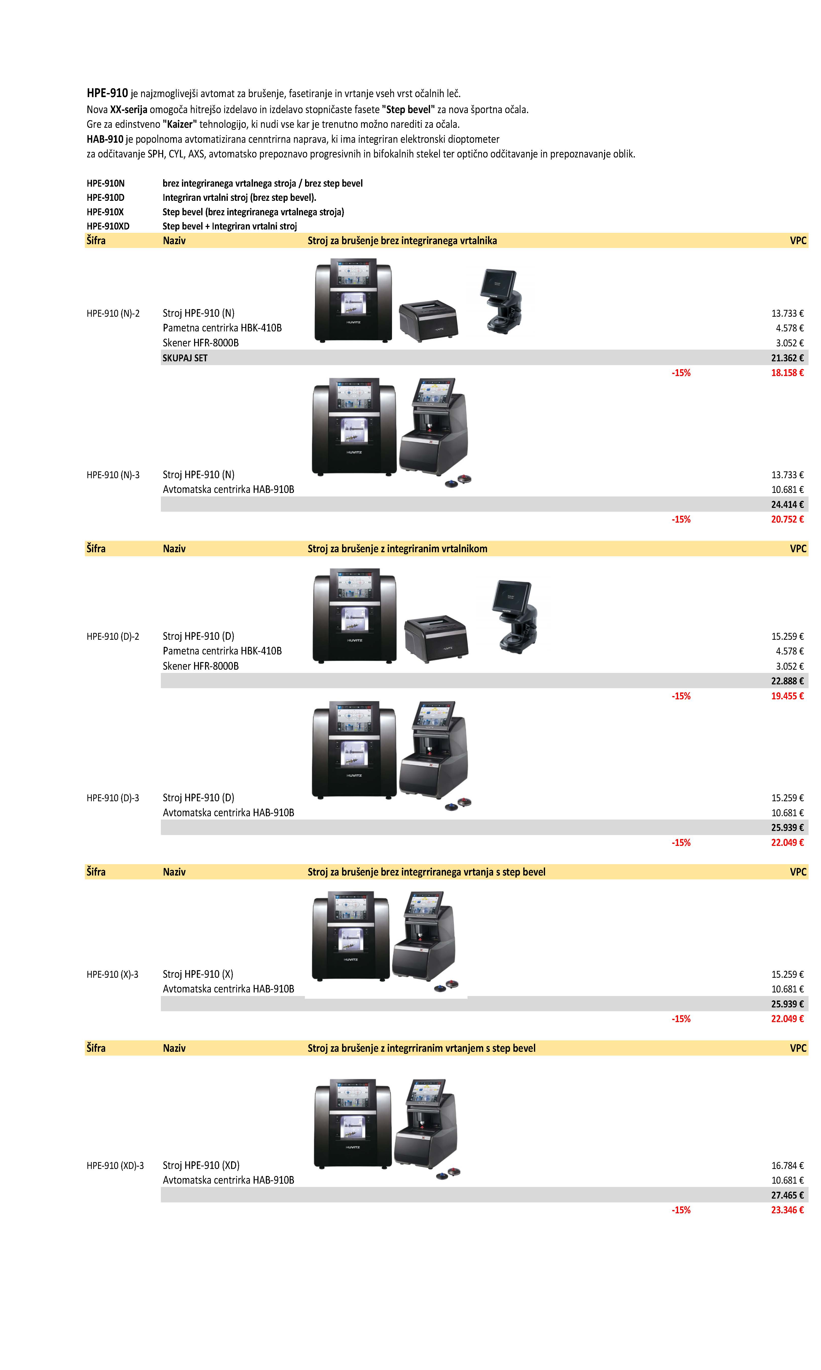 HPE-910 XD - Značilnosti in specifikacije - Integrirana funkcija vrtanja pod koti do 30° - Spremembe načina retuširanja za vrste utorov in poševnin - Možno žlebljenje konkavne oblike leče - Topo poševno rezanje za posebne oblike poševnin, npr. prisekano koničasto poševno rezanje - Minimalno brušenje prahu med rezkanjem - Natančno nastavljivo mini poševno rezanje - Delno žlebljenje in oblikovanje - Hibridno poševno rezanje za kombiniranje utora in poševnega rezanja na eni leči - Natančno nastavljiv položaj poševnega rezanja ali utora v korakih po 0,01 mm - Funkcija sesanja: Pripravljeno za priključitev zunanjega odsesovalnega sistema za zmanjšanje vonja in prahu - Zmogljiv in vzdržljiv motor z neposrednim pogonom za brusilne plošče - Hitrejše merjenje debeline leče s hkratnim skeniranjem z dvema senzorjema - Hitra obdelava podatkov zahvaljujoč zmogljivemu procesorju - 9,7-palčni LCD-zaslon na dotik Dimenzije (Š x V x G): 540 x 580 x 472 mm Teža: 51 kg HAB-910 Autoblocker Huvitz HAB-910 HAB-910 je pravi Vsestranski med samodejnimi blokatorji – ta naprava 3 v 1 ponuja samodejni 3D-sledilnik, sistem blokiranja in izjemen hitri vertex merilnik. Ta kombinacija zagotavlja natančnost in maksimalno preciznost, uporabniku prijazen vmesnik pa poudarja intuitivno upravljanje. V primerjavi s predhodnikom blokira štirikrat hitreje, zaradi česar je HAB-910 najhitrejši samodejni blokator na trgu. Senzor Hartmann-Shack zagotavlja impresivno briljantnost in zaznavanje laserskega graviranja. Številne samodejne funkcije zagotavljajo zanesljivo centriranje in blokiranje, kar ima za posledico znaten prihranek časa. Preprosto namestite lečo na merilno napravo, HAB-910 pa za ostalo poskrbi popolnoma samodejno in intuitivno. Značilnosti in značilnosti: - Naprava 3 v 1: vertex merilnik, 3D-sledilnik in samodejni blokator - Preprosta in intuitivna navigacija po meniju - Skeniranje in blokiranje sta popolnoma avtomatska - Samodejno zaznavanje okvirjev, vzorčnih leč ali oblikovanih leč v sledilniku - Inteligentni način zagotavlja hitro namestitev vertexa Merjenje, prepoznavanje oblike in stekla - Samodejna fiksacija stekla s podporo s polno točko - Samodejno prepoznavanje oznak, žigov ali šivov - Popolnoma samodejni prevzem bloka zagotavlja udobje zahvaljujoč novemu magnetnemu bloker - Samodejni izračun položaja bloka in natančno pozicioniranje stekla